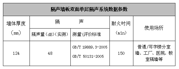 無機高強隔聲墻板單板隔聲為30dB,可通過不同的結構系統,將隔聲量提高,分別有雙面單層(48dB)、雙面雙層(52dB)、雙面雙龍骨五層(59dB)等。具體數據如下: